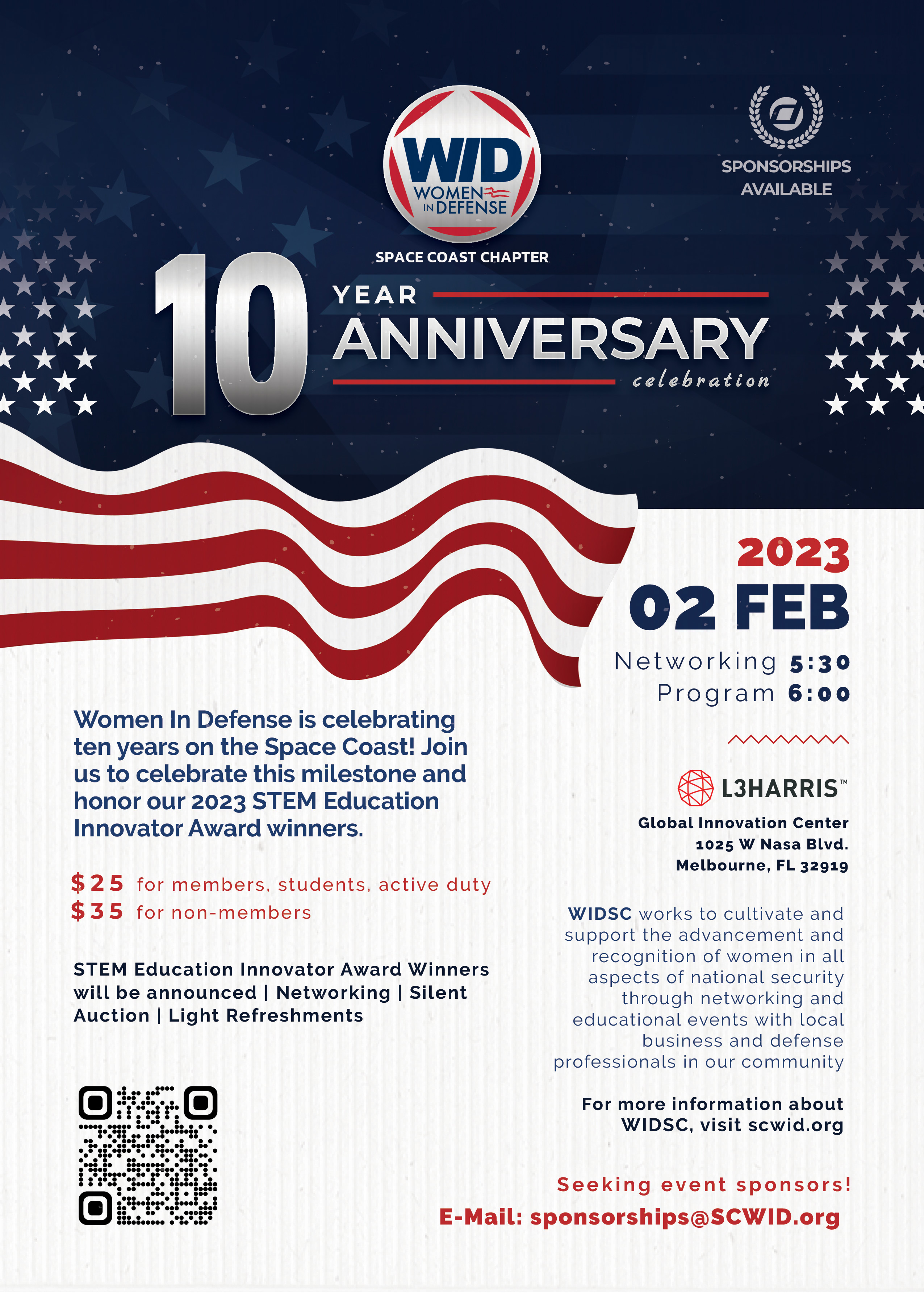 Women In Defense is celebrating ten years on the Space Coast! Join us on Thursday, February 2nd, 2023, to celebrate this milestone and honor our 2023 STEM Education Innovator Award winners. This will be a great professional networking opportunity to meet other members old and new. Active-duty military and students are encouraged to attend. Light refreshments will be served. Become an event sponsor!